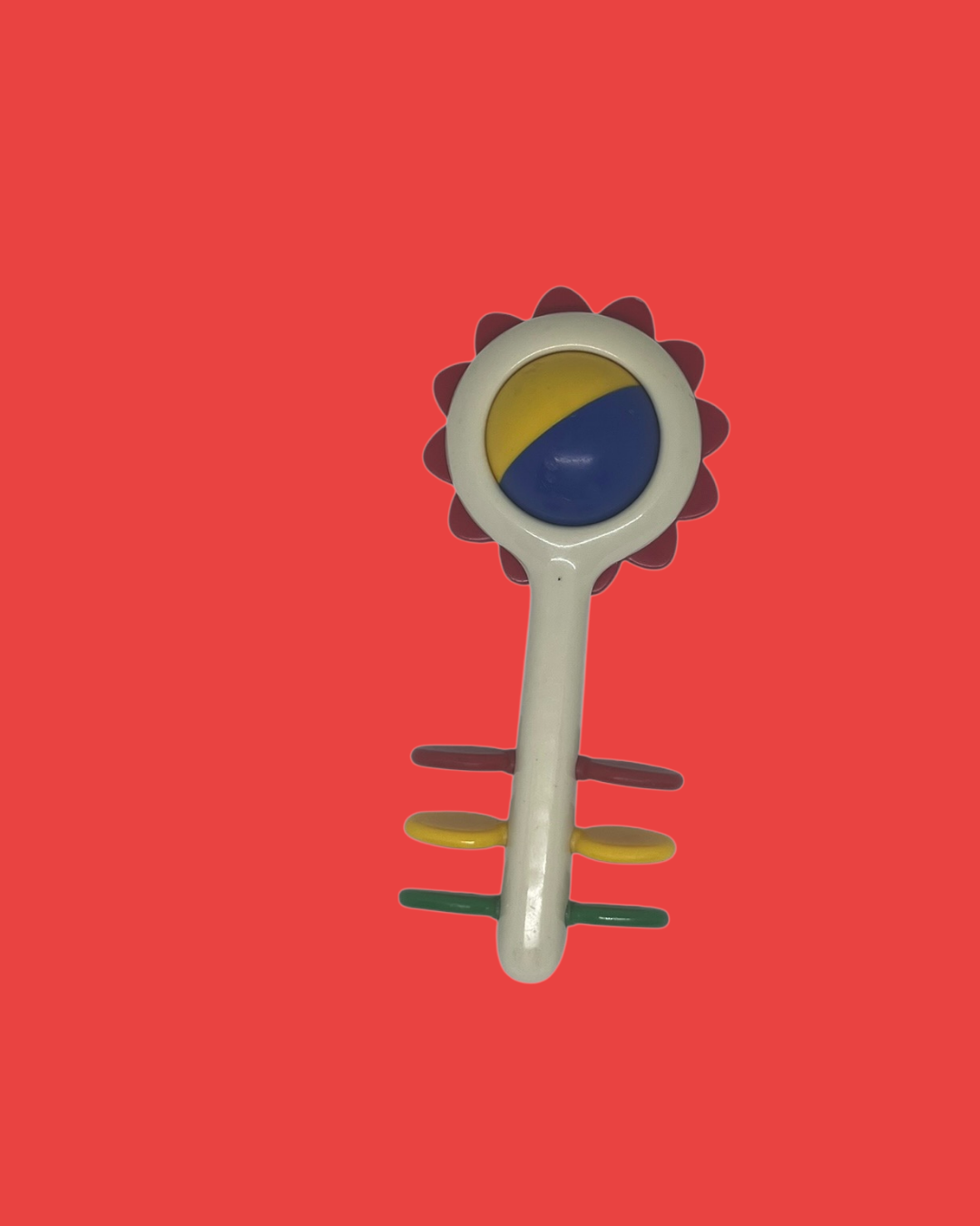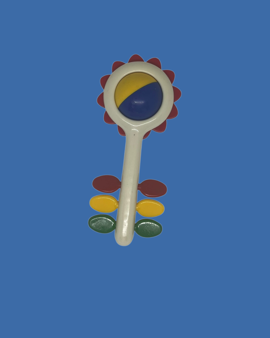 Ambi toys rammelaar in de vorm van een bloem. Het balletjes kan draaien, de rode bloemblaadjes kunnen ronddraaien en ook aan de drie gekleurde staafjes kan gedraaid worden. Het gezichtje op de bal is niet meer zichtbaar bij deze rammelaar.