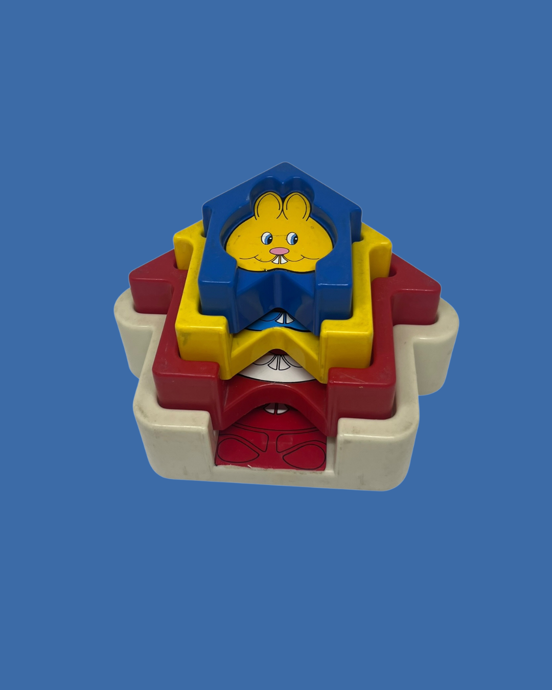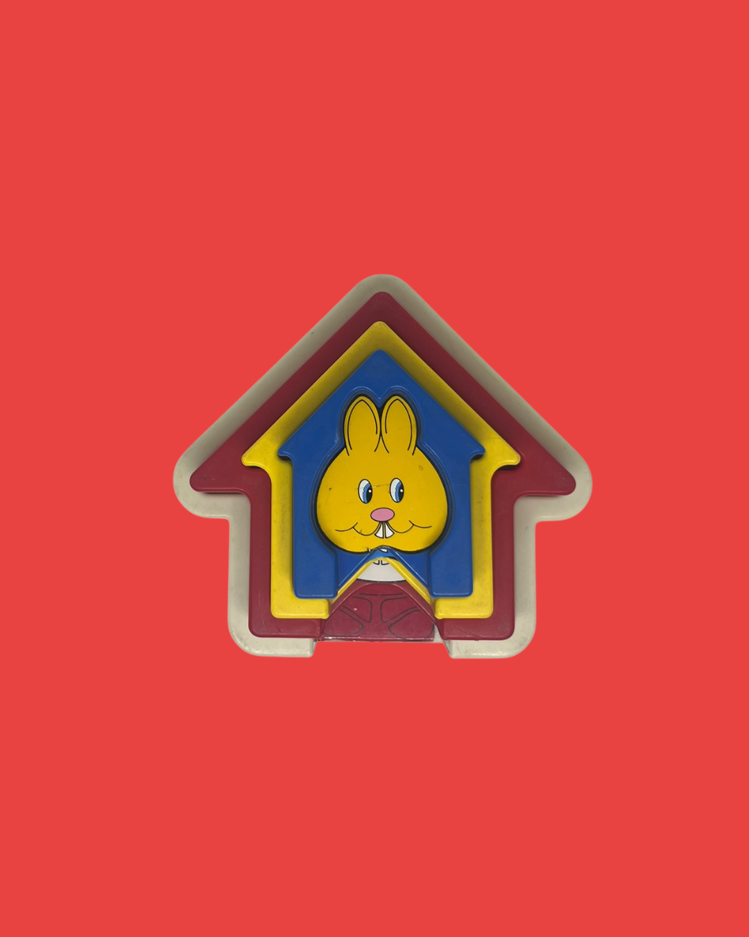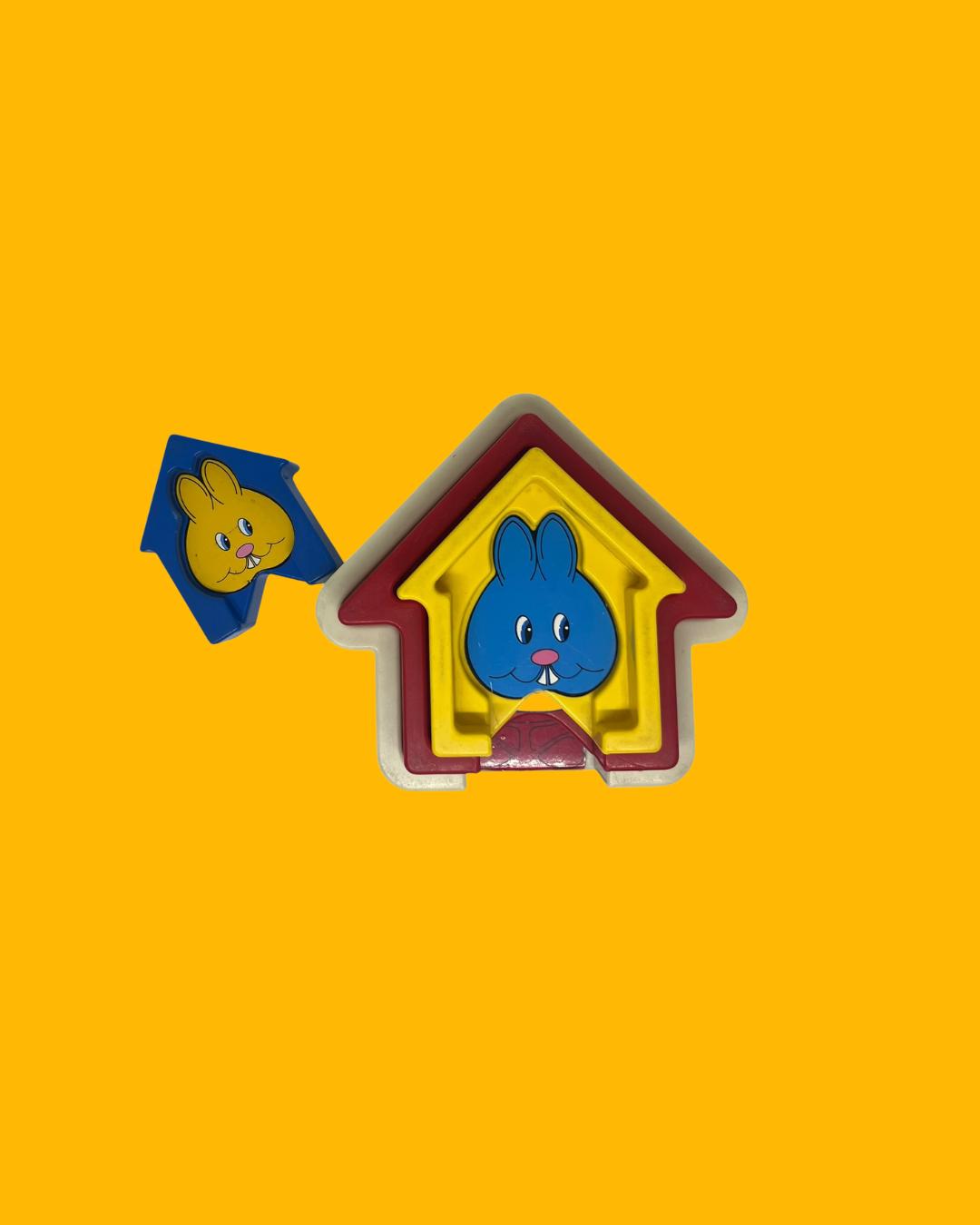 4 konijntjes wonen elk in hun eigen huisje. De huisjes passen mooi in elkaar.