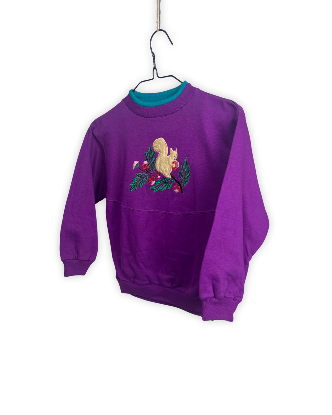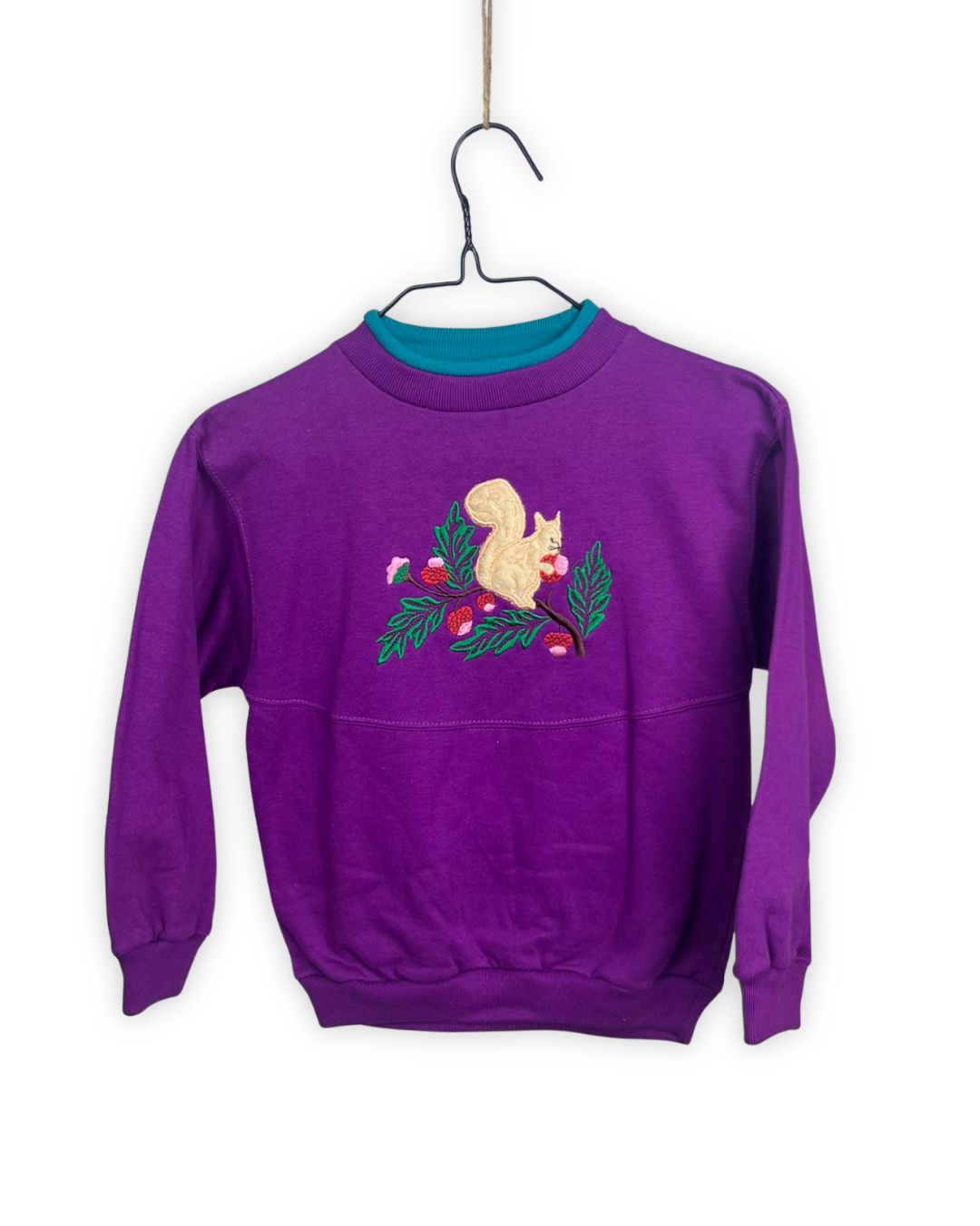 Paarse trui met appelblauwzeegroene randjes en geborduurde eekhoorn.