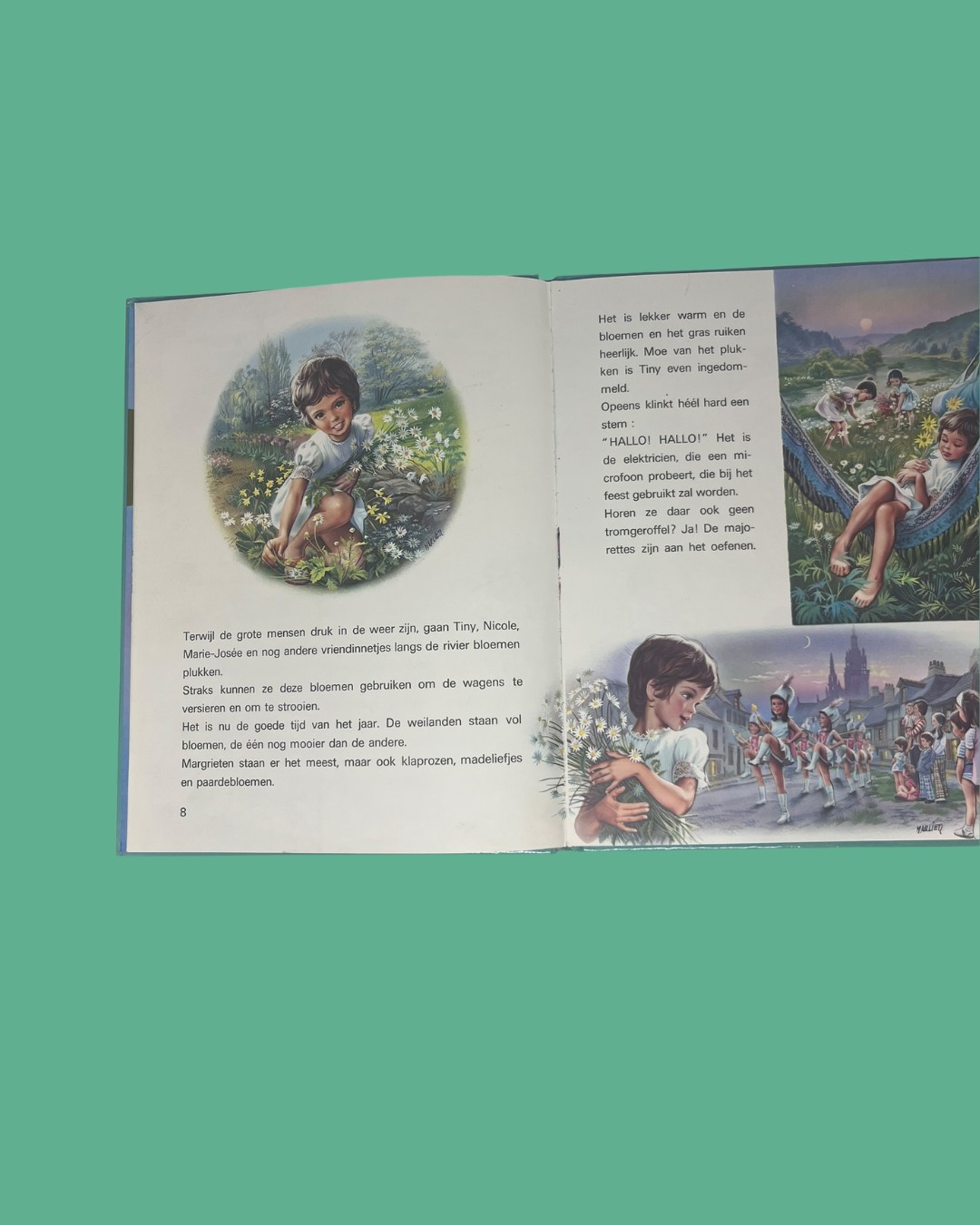 Boek met harde kaft, dat al behoorlijk is gelezen, maar het verhaal heeft de schattigste tekeningen uit de goeie ouwe tijd.